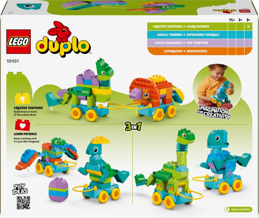 Upptäck detta färgglada LEGO DUPLO Town 3-i-1 Dinosaurier på hjul som gör lekstunderna rasande roliga.