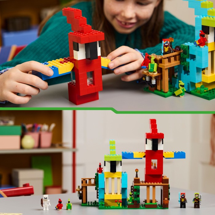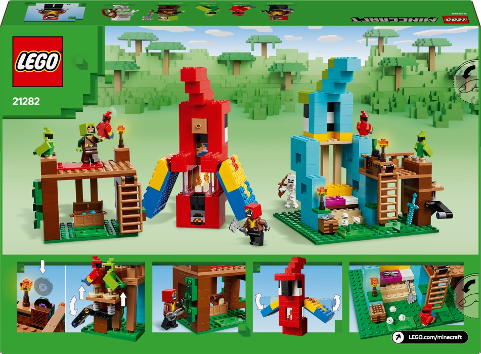 Med LEGO Minecraft Papegojhusen kan du resa in i djungellandskapet med djungeljägaren och fågeltränaren och bygga 2 papegojformade hus.