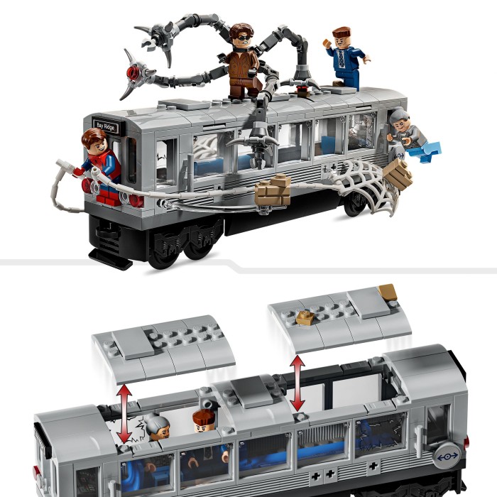 I setet LEGO Super Heroes Marvel Spider-Man mot Doc Ock: tunnelbanescenen, skenanar ett tåg okontrollerat fram med J. Jonah Jameson och Aunt May ombord!