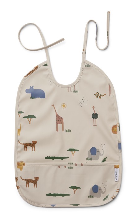 Praktisk och vattentät haklapp från Liewood med beige botten och ett gäng söta safaridjur som tryck. Haklappen har en praktisk ficka fram som fångar upp mat och skyddar kläderna.. Tillverkad i 100% Oeko-tex återvunnen polyester.