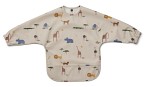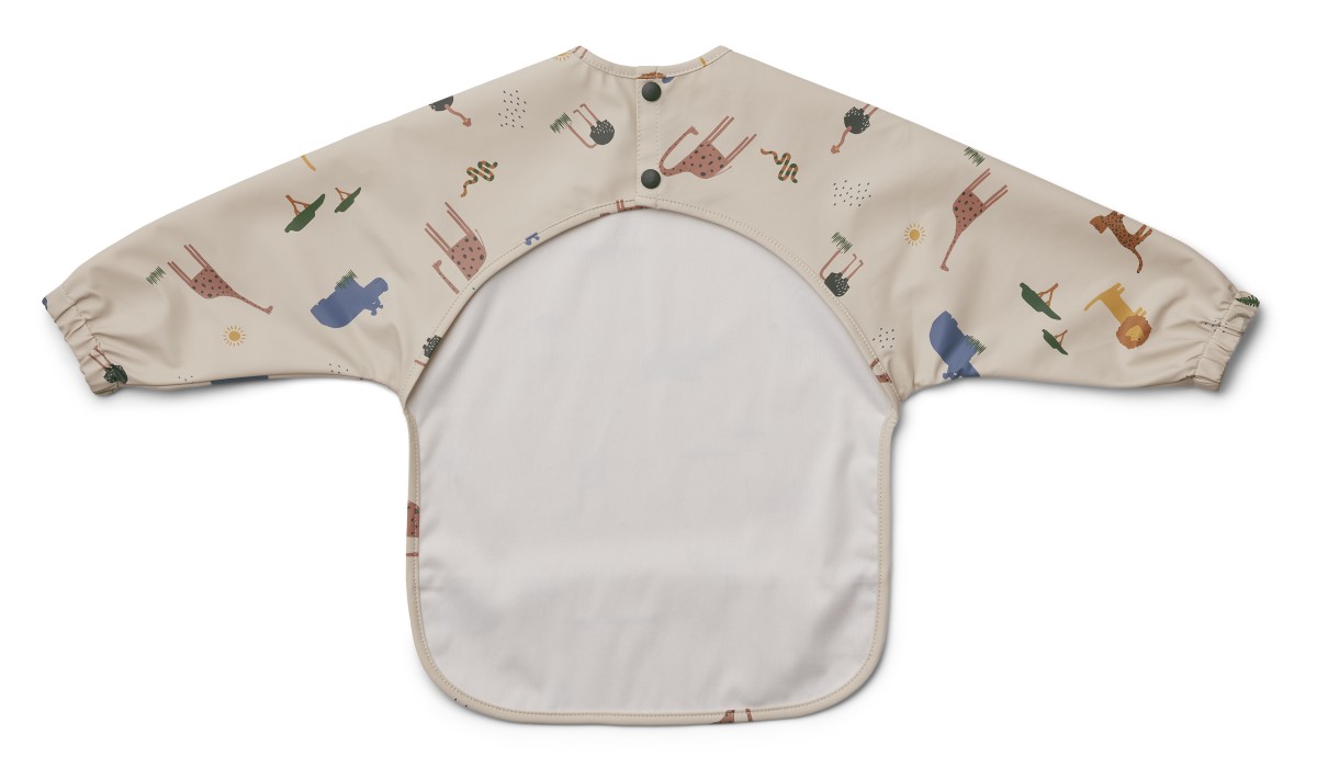Vattentät haklapp från Liewood med långa ärmar och en praktisk ficka som fångar upp sådant som tappas. Haklappen har en cremevit botten med ett lekfullt djurmönster och enkel att torka av och rengöra.