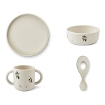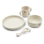 Vivi matservis i ett smidigt 4-pack set från Liewood. Detta oslagbara set består av en tallrik, en skål, en drickmugg, och en sked, alla i matchande färg och mönster. Setet är tillverkat i greppvänligt och slitstarkt silikon med nylonfyllning.
