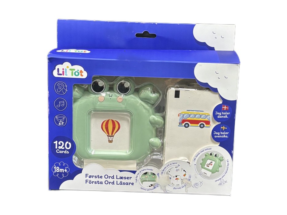 Med Lil'Tots elektroniska kortläsare kan ditt barn enkelt koppla bilder till ord och utveckla sitt språk på ett lekfullt sätt. Setet innehåller 60 kort med totalt 120 ord och bilder på både danska och svenska. En pedagogisk leksak som passar barn från 18 månader och uppåt.