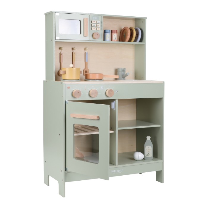 Med Little Dutch Leksakskök kan ditt barn förbereda de godaste rätterna och bjuda familjen eller sina favoritdockor och gosedjur på hemgjorda måltider. Köket levereras med två stekpannor, en ugnsvante och en grytlapp. De realistiska knapparna med illustrationer gör leken ännu mer levande och engagerande.