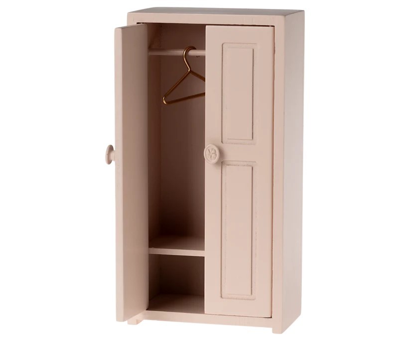 Hjälp mössfamiljen att hålla ordning med den charmiga Maileg Garderob Mus! Den ljusrosa garderoben är perfekt för att organisera deras kläder och tillbehör.