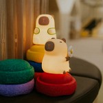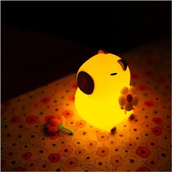 Skapa en mysig och lekfull atmosfär i barnrummet med denna mjuka LED-nattlampa i form av en kapibara! Lampan är ljusbrun med ett sömnigt, gulligt ansikte och håller en liten blomma i handen, vilket gör den extra charmig och rolig för barn.
