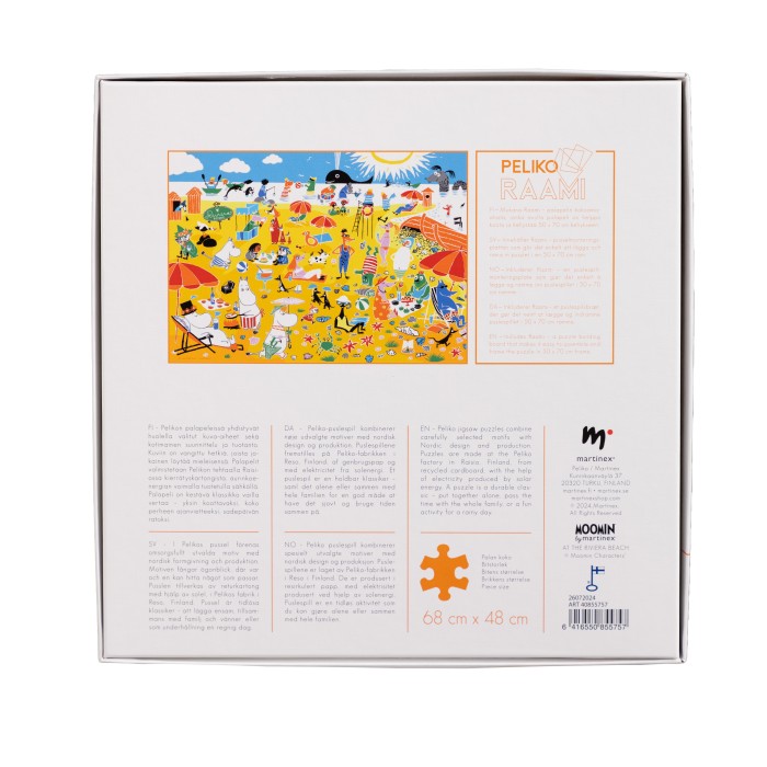 Det färgglada och detaljerade motivet fångar den härliga atmosfären vid stranden. Det lagda pusslet mäter 68 x 48 cm. Tillverkat i Finland av returkartong och solel. Innehåller Peliko Raami, en praktisk pusselmonteringsplatta som gör det enkelt att pussla och rama in pusslet i en standardram (50 x 70 cm).