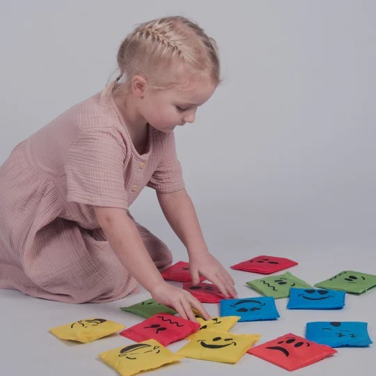 Varje påse har en färg och ett tydligt tryck med en känsla – som glad, arg, ledsen eller förvånad – och uppmuntrar till samtal, reflektion och igenkänning. Perfekta för lekar och övningar som stärker barnens emotionella utveckling, sociala färdigheter och empati.