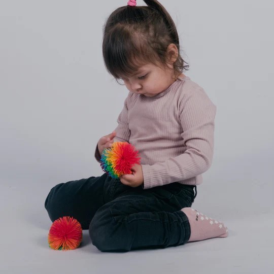 De mjuka gummitrådarna gör bollen lätt att greppa för små händer – perfekt för barn som behöver fokusera, slappna av eller bara ha något roligt att pyssla med. Bollen är ljudlös och därför utmärkt att använda i klassrum eller andra lugna miljöer där koncentration är viktig.