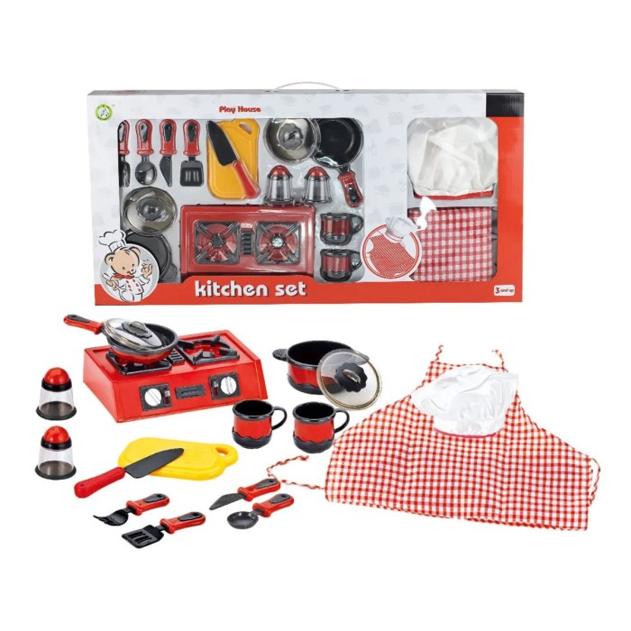 - Innehåll: Spis, kastruller, skärbräda, bestick, skålar, tillbehör, förkläde & kockmössa