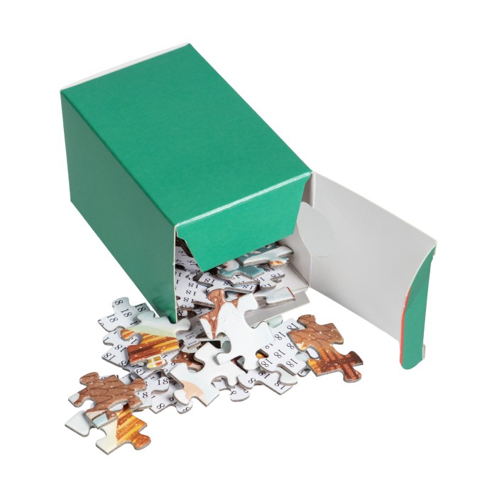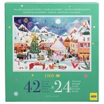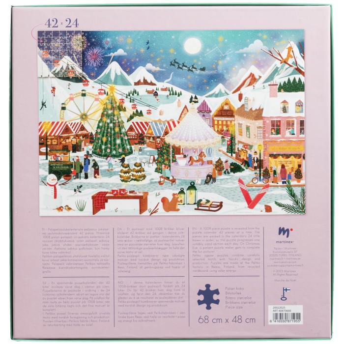 Räkna ner till jul med en unik julkalender i pusselformat! Varje dag öppnas en ask med 42 numrerade pusselbitar, och på julafton är det färdiga pusslet komplett, 1008 bitar med ett stämningsfullt motiv av julmarknad, karusell och fyrverkerier.