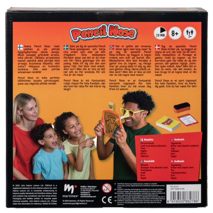 Det låter enkelt, men det blir snabbt kaos, skratt och tokiga teckningar när du bara får använda näsan. Ett roligt familjespel som bjuder på massor av skratt vid varje omgång.