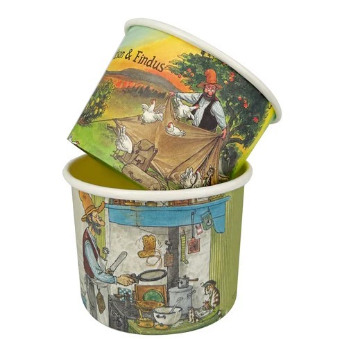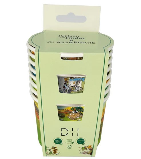 Dessa färgglada glassbägare är dekorerade med motiv från de älskade berättelserna om gubben Pettson och katten Findus – perfekta för barnkalas, sommarfika eller festliga vardagsstunder.