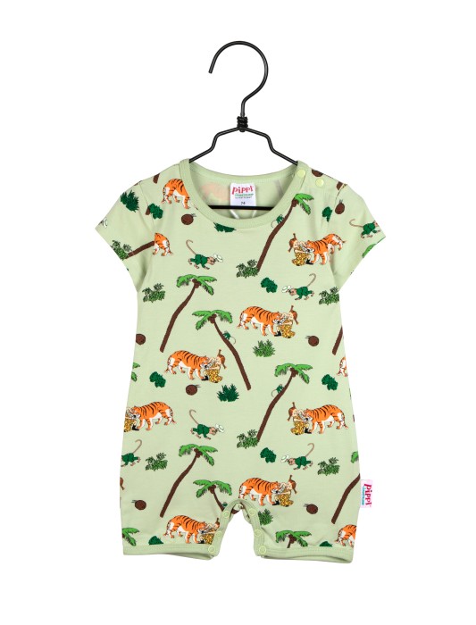 Kortärmad sparkdräkt med korta ben, ett perfekt sommarplagg för varma dagar. Sparkdräken är mintgrön och har ett helmönster av Pippi Långstrump, Herr Nilsson och en tiger. Knäpps med tryckknappar på ena axeln och i grenen.