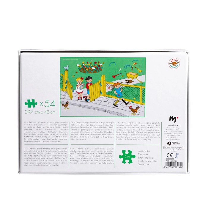 Pusslet består av 54 bitar och ger ett färdigt motiv på 42 x 30 cm. Tillverkat av returkartong och producerat i Finland, vilket gör det både hållbart och miljövänligt. Perfekt för alla Pippi-fans som gillar att utmana sina pusselkunskaper!