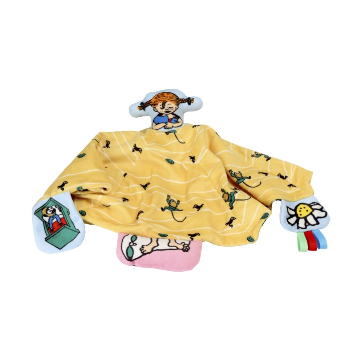 Supermjuk Pippi-snuttefilt med färgglad illustration och roliga band att känna på. Perfekt i vagnen, sängen eller famnen och lätt att ta med överallt. Stimulerar sinnen och blir snabbt barnets favorit. Från Micki, inspirerad av Pippi Långstrump.