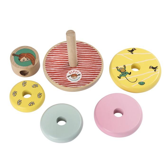 Stapla ringar och Pippi på toppen! Rolig träleksak som tränar motorik, koordination och tålamod. Perfekt babyleksak för nyfikna små barn. Från Micki, inspirerad av Pippi Långstrump.