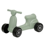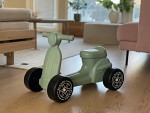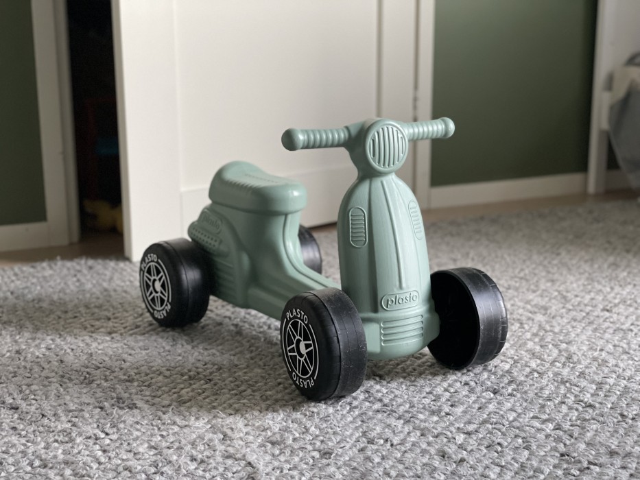 Skotern är grön och utrustad med tysta hjul, vilket gör den idealisk för både barnets lek och förälderns sinnesro. Designad för att passa in i ett modernt hem.