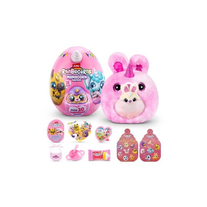 Rainboville har fått en ny stjärna – Rainbocorns Mamacorn Surprise! Detta magiska ägg är fullpackat med spänning och lekglädje. Kläck det färgglada ägget och upptäck över 30 överraskningar som väntar på dig. Inuti gömmer sig en av sju unika Mamacorn plushes, var och en med sin egen charm och personlighet. Men det slutar inte där – tillsammans med din Mamacorn hittar du även en mystisk baby Rainbocorn att avslöja. Vilken kommer du att få?