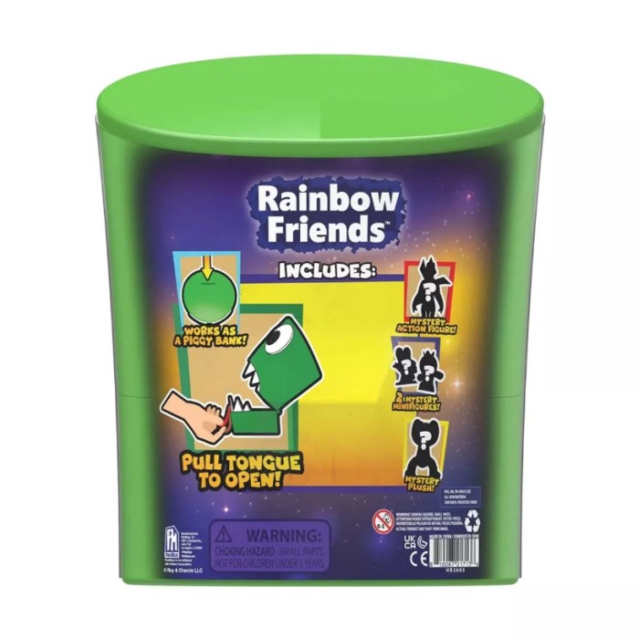 Inuti gömmer sig en spännande samling med actionfigur, två minifigurer och en mjuk plysch. Behållaren fungerar dessutom som en spargris. Perfekt för samlare och fans av Rainbow Friends!