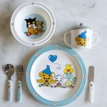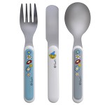 Besticksetet innehåller en kniv, en gaffel och en sked är perfekt anpassade för små händer och munnar. Besticken är tillverkade av ABS-plast och rostfritt stål. Dessa bestick levereras i en elegant och praktisk presentkartong.