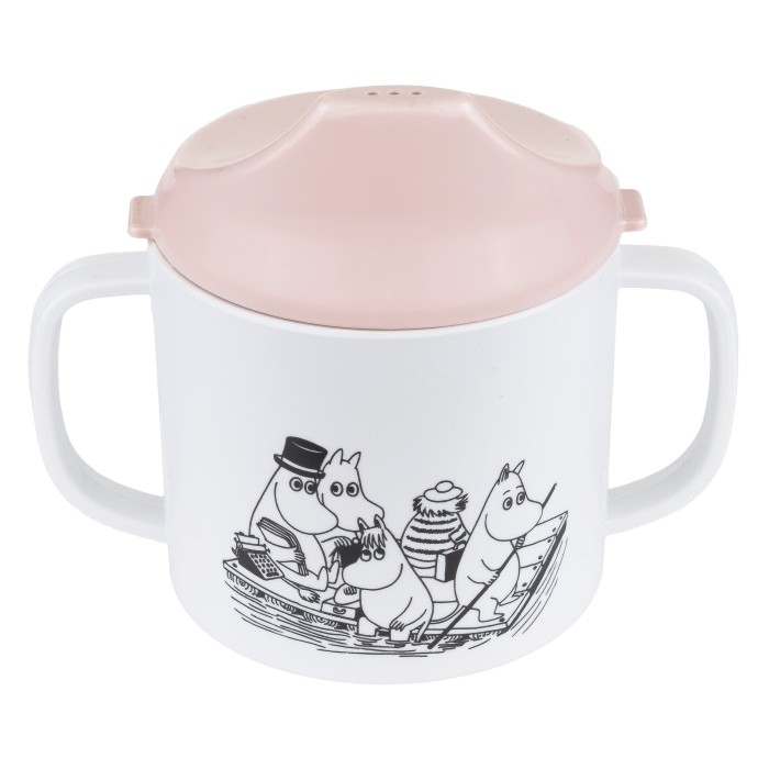 Pipmugg med två handtag med Mumin-motiv från Rätt Start. Locket sitter ordentligt med hjälp utav en silikonring och i pipen finns ett spillstopp som begränsar flödet. När barnet blir äldre kan ventilen plockas bort, Muggen är tillverkad i RPET vilket är ett miljövänligt och tåligt material. Rätt Starts produkter i RPET bidrar till minskat avfall och lägre koldioxidavtryck.
