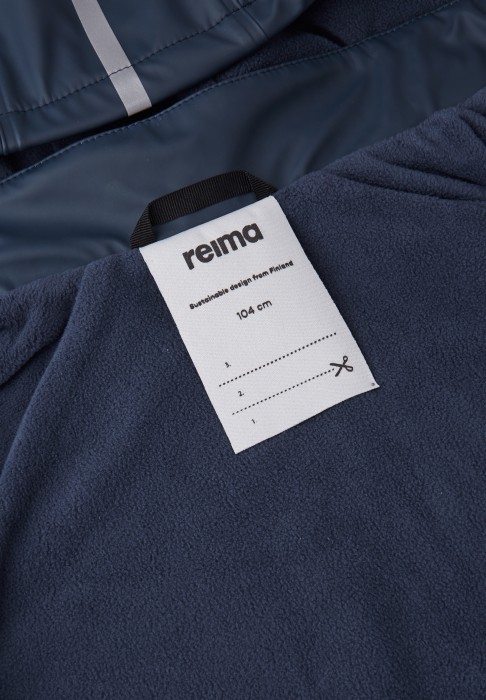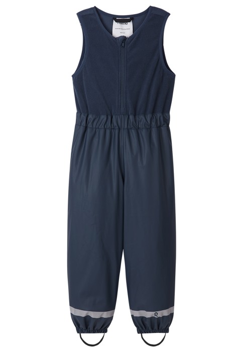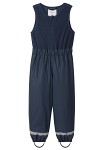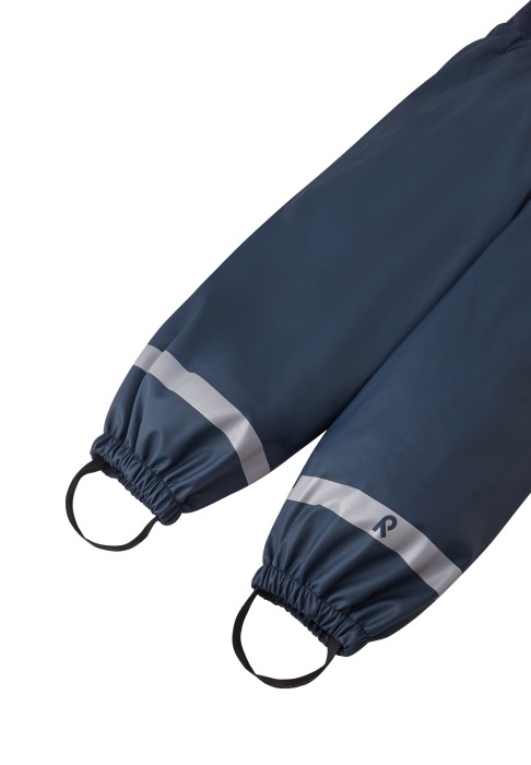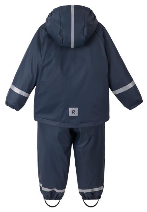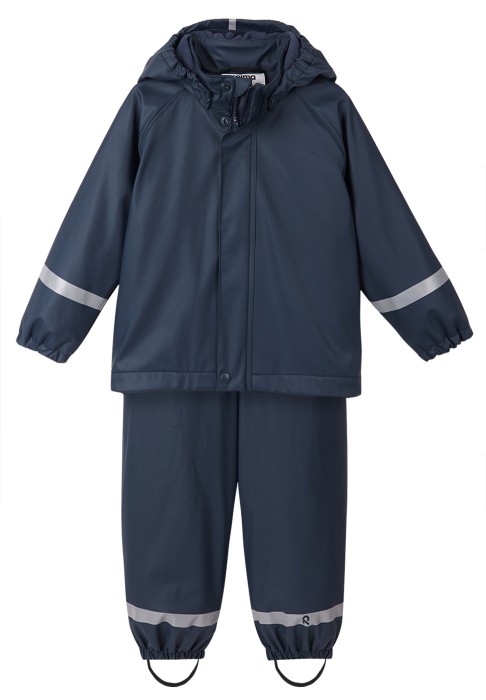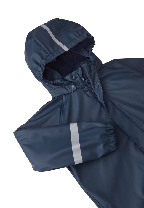 Klassiskt regnställ för barn som skyddar mot regn och lera. De svetsade sömmarna är helt vattentäta. Den avtagbara huvan skyddar inte bara mot regn – den är också säker under lek utomhus. Huvan är fäst med tryckknappar och lossnar lätt om den fastnar i något. Snickarbyxor med elastisk midja för bra passform. De många detaljerna i reflexmaterial får små äventyrare att synas bättre när det mörknar ute. Materialet i detta PVC-fria regnställ är Öko-Tex-certifierat.