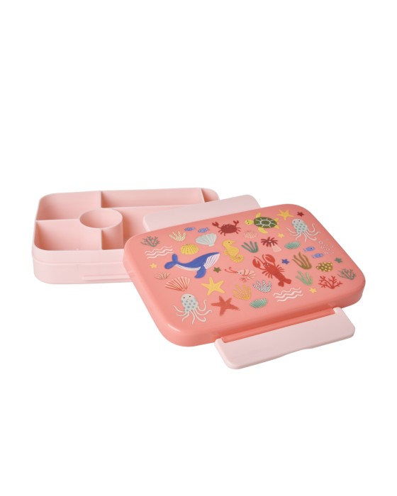 Denna charmiga matlåda har sex praktiska fack och ett blått lock dekorerat med söta havsdjur. Perfekt för att hålla maten fräsch, organiserad och inbjudande – både i skolan, på utflykten eller till förskolan.
