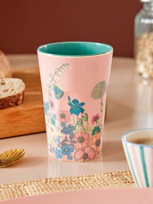 Hög mugg i fint mönster från Rice tillverkad i melamin. Perfekt att ha med på picknicken eller hemma i köket. Muggen är både tålig och dekorativ. Kan diskas i maskin.