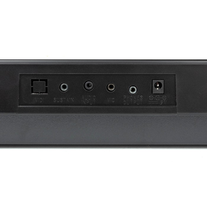 - Output för hörlurar, mic input, aux in /sustain pedal input