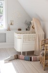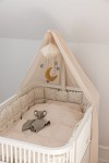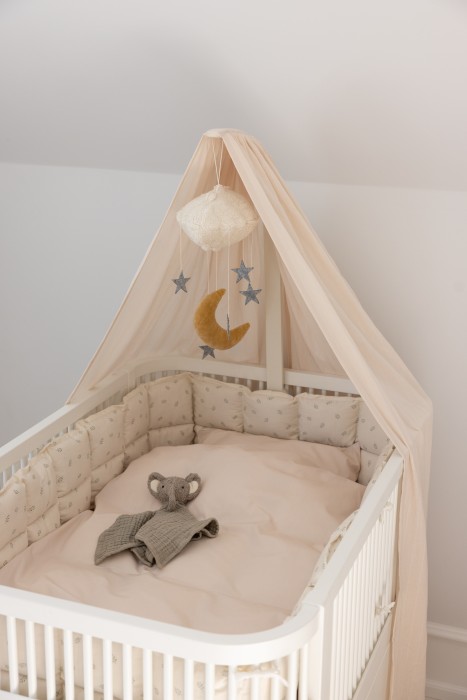 Fin sänghimmel från Sebra i en luftig bomullskvalité med vävda ränder som ger ett elegant uttryck. Sänghimmeln är designad för att kunna fästas på en Sebra mobilarm och därmed komma närmare sängen, precis som en vagga med sänghimmel. För att fästa en mobil i mobilhållaren och sänghimlen kan du skära ett litet snitt i tyget.