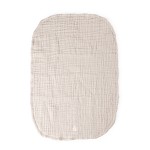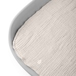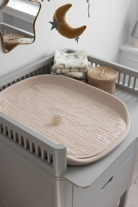 Överdraget består av sex lager muslin och är mjukt och skönt för den lilla att ligga på när det är dags för blöjbyte. Förutom att göra skötbädden extra mjuk så skyddar överdraget vid eventuell olycka så att skötbädden håller sig ren och fräsch längre. Skötbäddsöverdraget är vändbart och det fina hålmönstret går hela vägen runt basen. Både fint och praktiskt!