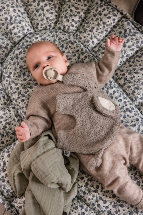 Elefanten har mjuka öron och en knut på svansen som små fingrar kan pilla på för extra trygghet. Den mjuka snuttefilten blir snabbt en oumbärlig favorit som skapar igenkänning vid läggdags, mysstunder och när tröst behövs.