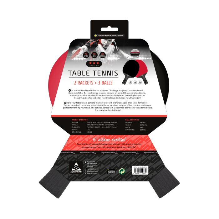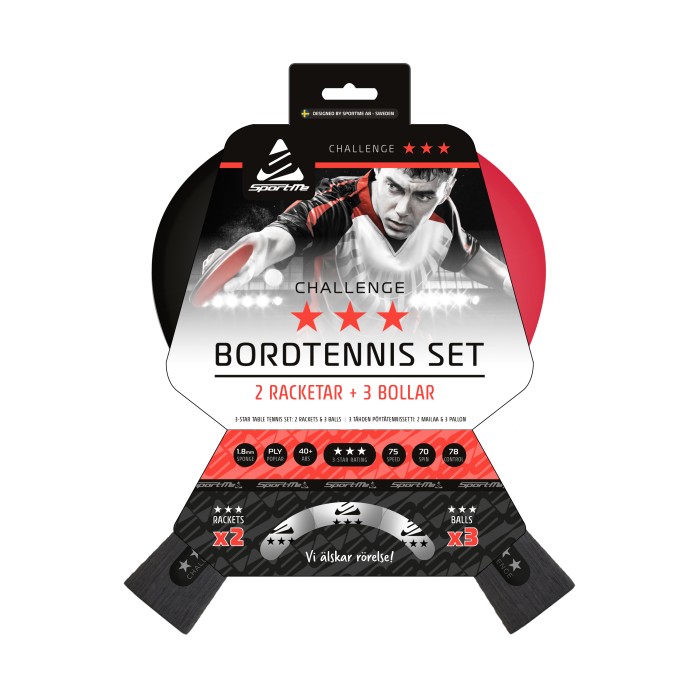 Med detta 3-stjärniga bordtennisset från SportMe kan du ta ditt bordennisspel till nästa nivå! Setet består av 2 st trestjärniga racketar och 3 st bollar.