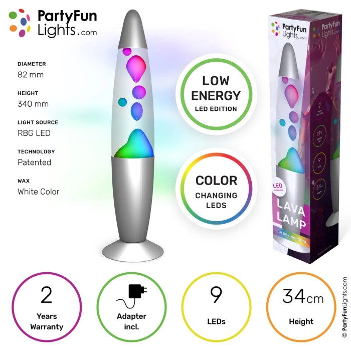 Skapa en mysig och färgglad atmosfär med denna lava-lampa med RBG LED-ljus. Lampan har vit vax som långsamt rör sig och skapar ett hypnotiskt, dekorativt flöde av färger. Den energieffektiva LED-tekniken gör lampan lågförbrukande, och med färgskiftande LED-lampor (9 st) och medföljande adapter kan du njuta av en stämningsfull belysning på ett enkelt sätt.