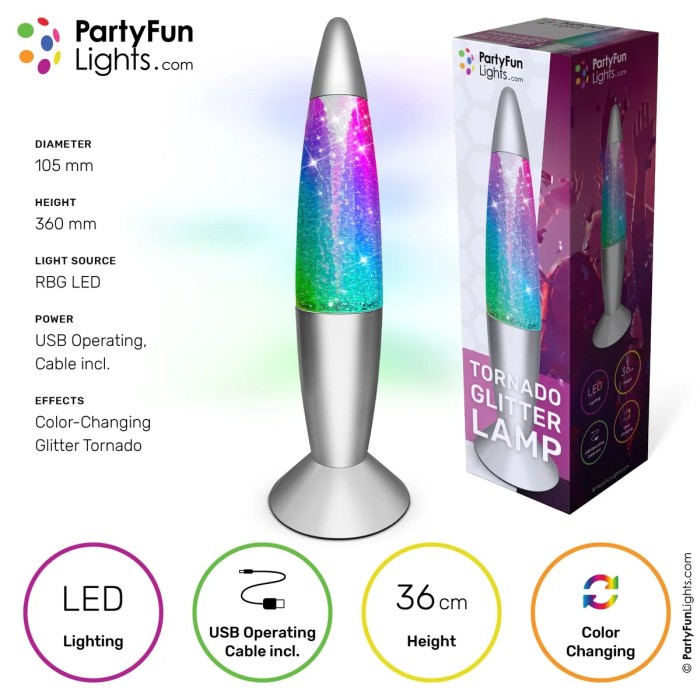 Denna dynamiska LED-lampa har 9 lysande LED-lampor som skiftar i ett spektrum av färger och skapar ett ständigt föränderligt visuellt skådespel. Den fascinerande glittereffekten fångar blickar och ger en unik atmosfär i varje rum.
