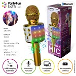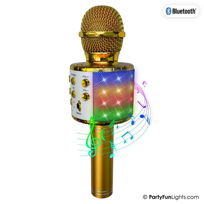 Denna guldfärgade karaoke-mikrofon är perfekt för barn som älskar musik och show. Mikrofonen har en inbyggd högtalare, trådlös Bluetooth-anslutning, ekoeffekt och ett ljudaktiverat LED-ljus som ändrar färg – vilket gör varje framträdande extra spektakulärt!