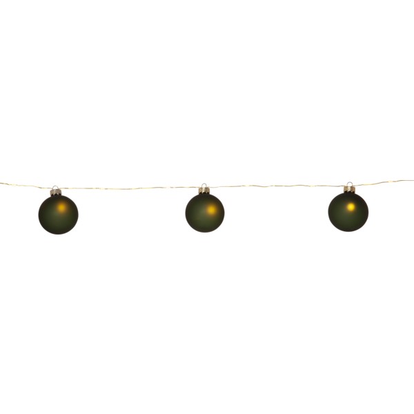 Vacker batteridriven ljusslinga med 8 st gröna glaskulor från Star Trading. Mässingsfärgad slinga med små ljuspunkter i varmvit LED. Perfekt för tex bordsdekoration och julgransbelysning och ger en härlig stämning i hemmet.