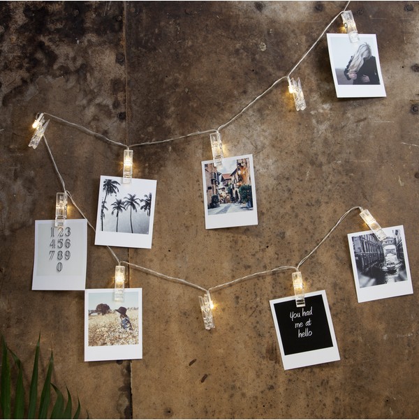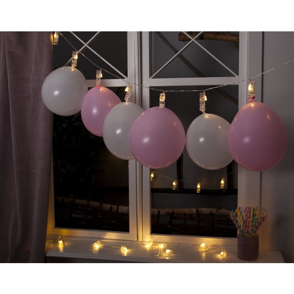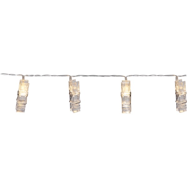 Batteridriven ljusslinga med klädnypor från Star Trading. Häng upp dina foton eller vykort eller dekorera med något festligt till kalaset. Slingan har 10st klädnypor med LED belysning. Obs! Batterier medföljer ej!