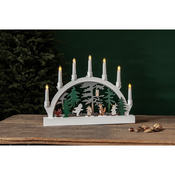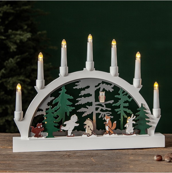 Skapa en magisk julstämning med detta dekorativa sceneri i laserskuret trä. Motivet föreställer en isbjörn, igelkott och räv som åker skridskor i en vintrig skogsglänta, redo att fira jul tillsammans med sina vänner.