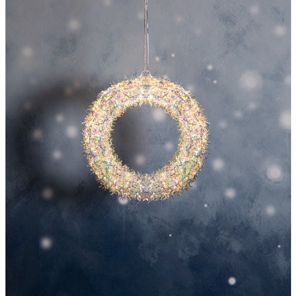 Skapa en värmande och stämningsfull atmosfär med denna LED-krans på 30 cm i diameter. Kransen är tillverkad av effektfullt skimrande PET-material som sprider ett mjukt och dekorativt ljus, perfekt för att lysa upp hemmet under både vardag och fest.