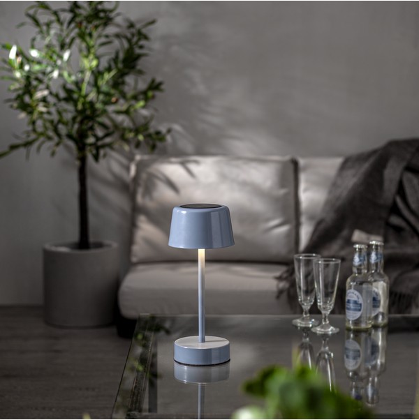 Solei från Star Trading är en stilren solcellslampa i mild blå nyans som passar perfekt på altan, balkong eller i trädgården. Den laddas smidigt via solen eller med den medföljande USB-C-kabeln, perfekt även vid molniga dagar. När mörkret faller sprider den ett mjukt sken med ca 10 lumen, vilket skapar en trivsam stämning utomhus.