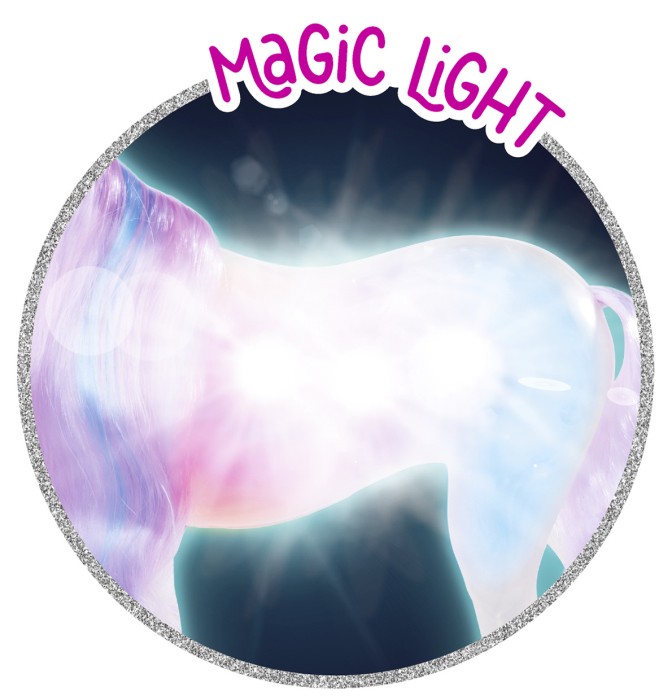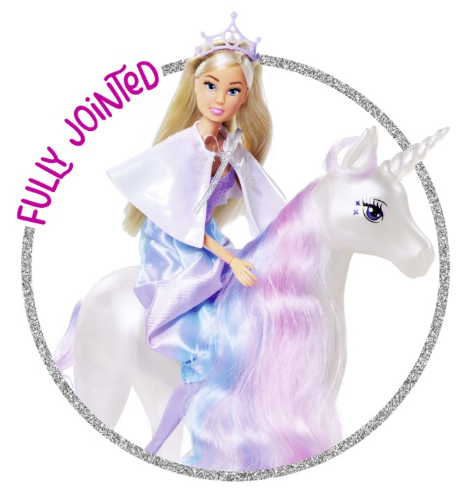Följ med in i en sagovärld med Steffi Love som prinsessa i en fantastisk magisk klänning och kappa. Hon är fullt rörlig och kommer tillsammans med en elegant enhörning med färgglatt hår som barnen kan borsta och styla. Enhörningen har dessutom magiska regnbågsljus som gör leken ännu mer spännande och förtrollande.