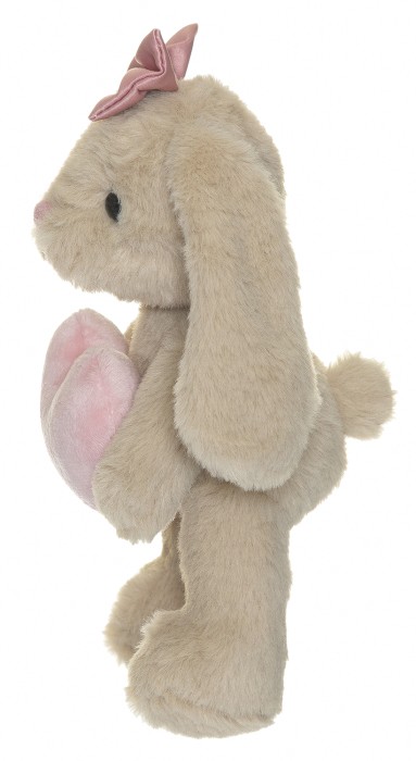 Denna mjuka och gosiga kanin bär en charmig rosett på huvudet och håller ett sött hjärta i famnen. Med sin vänliga uppsyn och mjuka plysch är den en perfekt present till dop, födelsedagar eller andra speciella tillfällen. En mysig kompis att krama och älska.