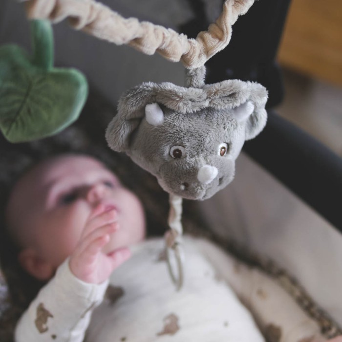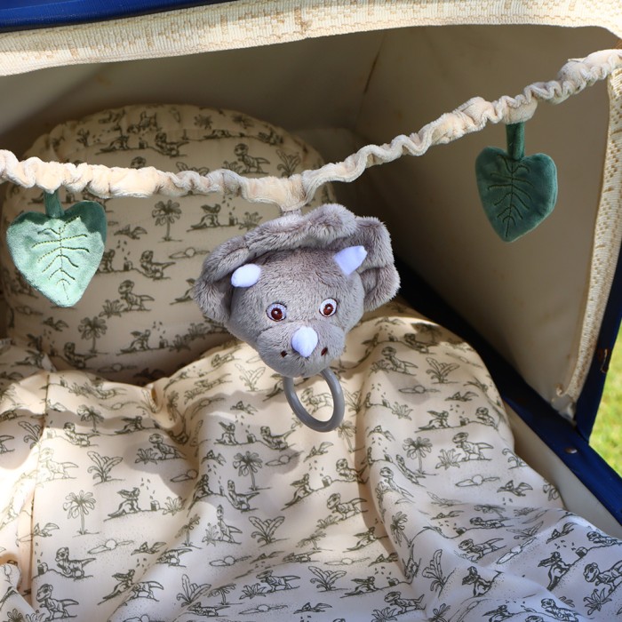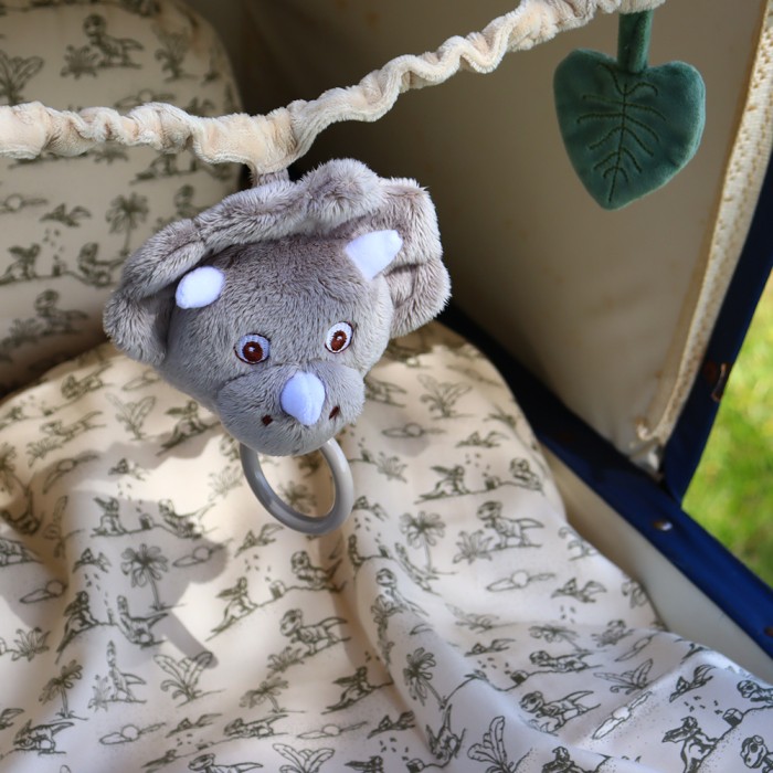 Barnvagnskedjan är tillverkad i mjuka och behagliga material och har spännande detaljer som en spegel, prasselljud och en speldosa i form av söt dinosaurie. En perfekt kombination av lek och utforskande för din baby!