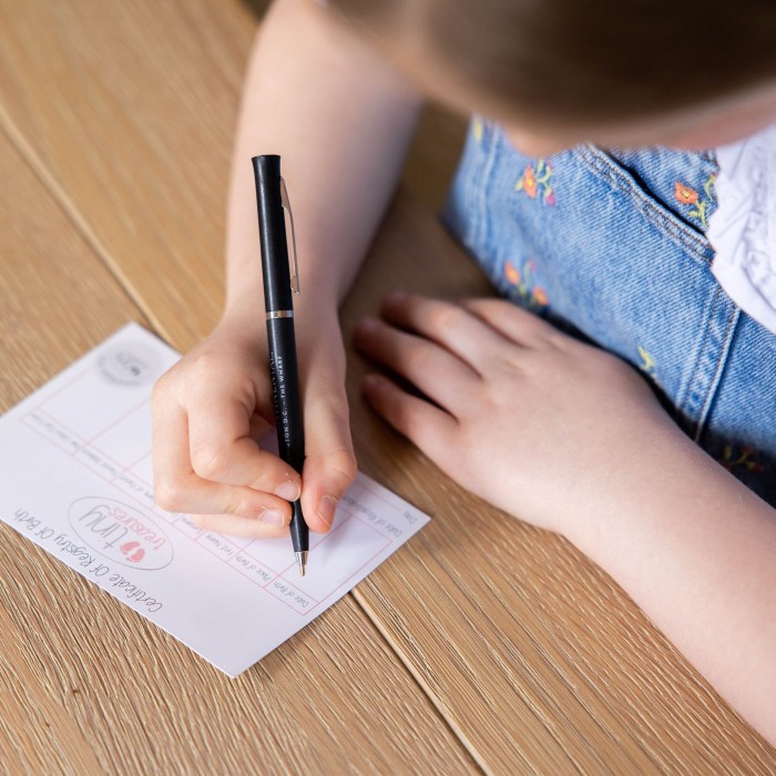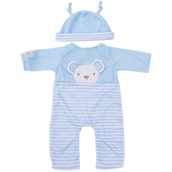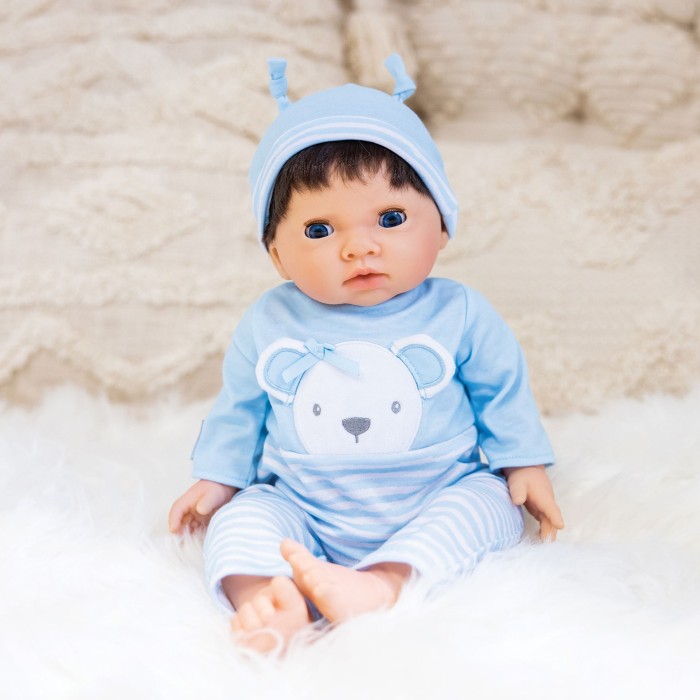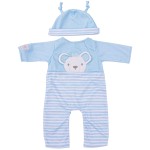 Klädd i en blå outfit med björntryck och matchande mössa, levereras dockan i en förpackning som liknar en bilstol – komplett med säkerhetsbälte. Ett födelseattest medföljer för att göra leken ännu mer personlig.