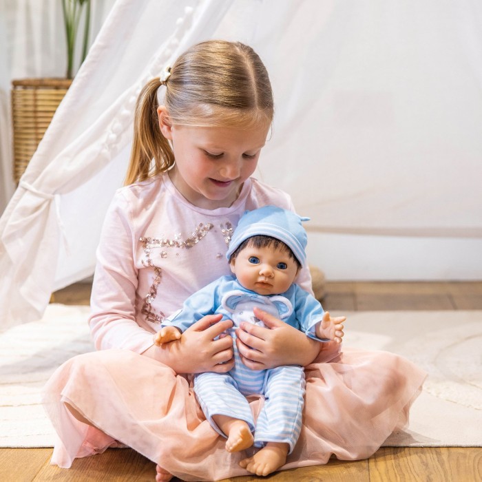 Denna 44 cm långa Tiny Treasures-docka är utformad för att kännas och se ut som en riktig bebis. Dockan har mjukt, babylikt hår, blundögon som stängs när den läggs ner och rörliga leder för en mer verklighetstrogen lek.