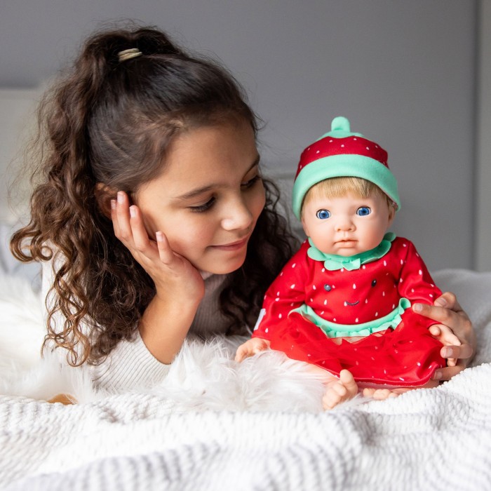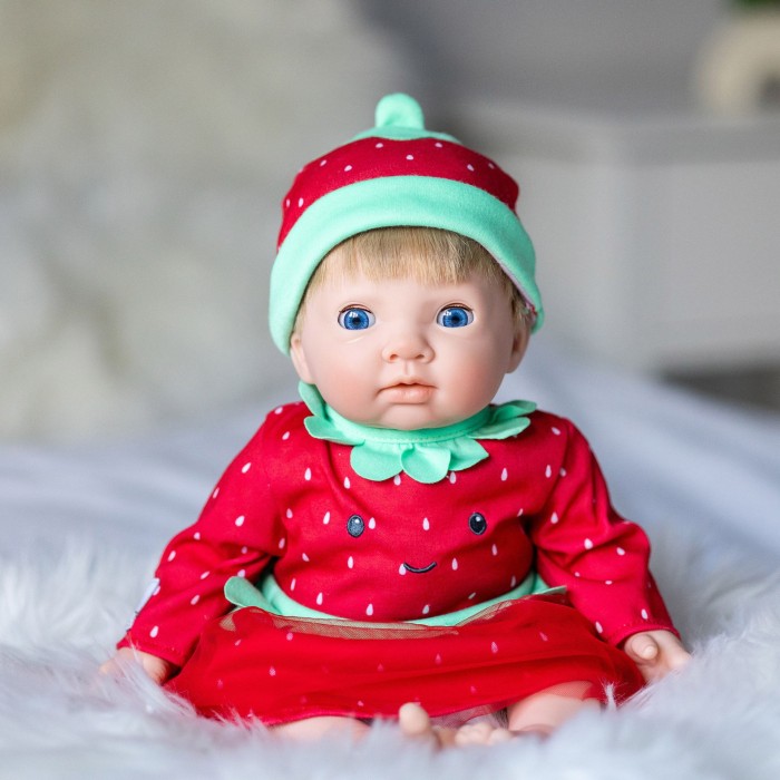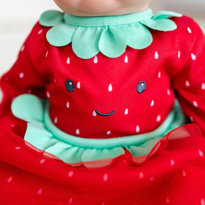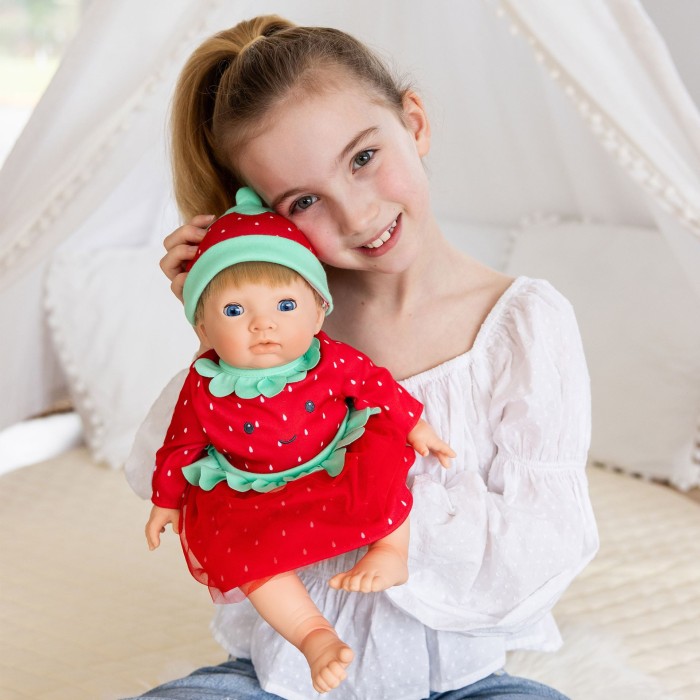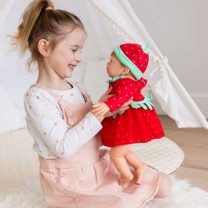 Setet består av en röd jordgubbsklänning med prickar och en matchande jordgubbshuva, vilket gör att din docka ser extra söt ut. Klädsetet passar dockor på 44 cm och är perfekt för fantasifulla och roliga dockäventyr.