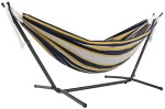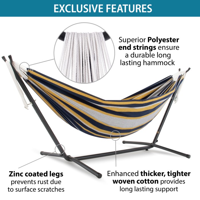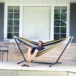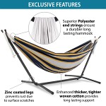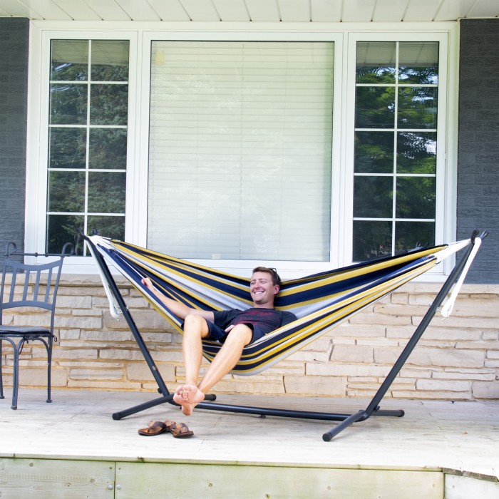 Upptäck friheten som kommer med vår hängmatta med universalt hängmattestativ, det gör det möjligt att njuta av avkopplande stunder i din hängmatta vart och när som helst. Både stativet och hängmattan är utformade för stabilitet och säkerhet, hängmattan har en tät väv som tål upp till 205 kg och stativet är tillverkat av kraftigt stål och monteras på några minuter utan verktyg. Känn lyxen av din egen personliga tillflyktsort och njut av stunder av välbefinnande med vår hängmatta!