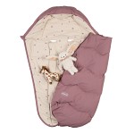 Huvan kan justeras med dragsko, fronten kan vikas ner för ventilation och bakdelen kan användas separat som sittunderlag eller lekmatta. Antiglidmaterial i ryggen håller åkpåsen stadigt på plats i vagnen, och ryggöppningarna gör det lätt att kombinera den med olika typer av selar.